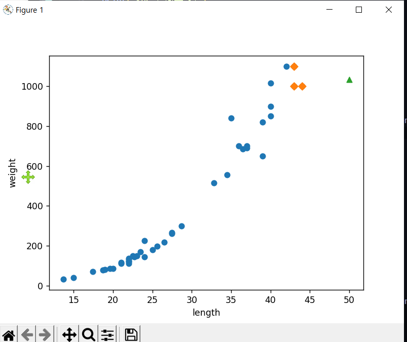 결과를 살펴보면 초록색 세모에 해당하는 새로운 데이터들에 가장 가까운 데이터 3개가 주황색 마름모로 표시된 것을 확인할 수 있다. 자 여기서 knr의 치명적인 단점이 나오게 된다. 이미 학습되어진 데이터의 수가 충분하지 않다면 새로운 데이터로 기존의 측정치와 좀 떨어진 데이터가 들어왔을 때 KNR모델은 아주 동떨어진 값을 반환하게 된다. kneighbors란 가장 가깝게 위치하는 데이터들의 평균을 구해 새로운 데이터의 값을 예측하기 때문이다. 또한 새롭게 들어온 데이터가 최대값이나 최솟 값을 가지는 경우 기존의 데이터에서 가장 가까운 데이터들의 평균을 구하기 때문에 input은 최대값이나 최소값이 들어갔지만 예측치는 최대값이나 최소값이 나오지 못한다는 문제도 존재한다.