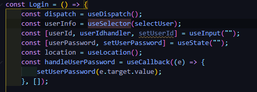 로그인이라는 기능을 구현할 때 user정보를 받아오고 싶다면 useSelector()hook안에 아까 정의한 store.getState.user = selectUser를 매개변수로 전달하면 된다. 그러면