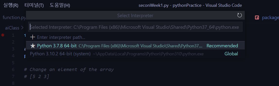 pip install numpy(module명) 명령어를 통해 정상적으로 패키지를 설치했음에도 불구하고 다음과 같은 문구가 vscode에서 뜬다면 이는 python의 interpreter문제이다. python은 c나 c++와는 작동하는 법이 또 달라서 interpreter라는 것을 거치게 되는데 이 interpreter의 버전이나 종류에 따라 설치되는 경로가 달라지거나 해석하는 방법이 달라져 다음과 같은 오류가 발생하는 것이다.